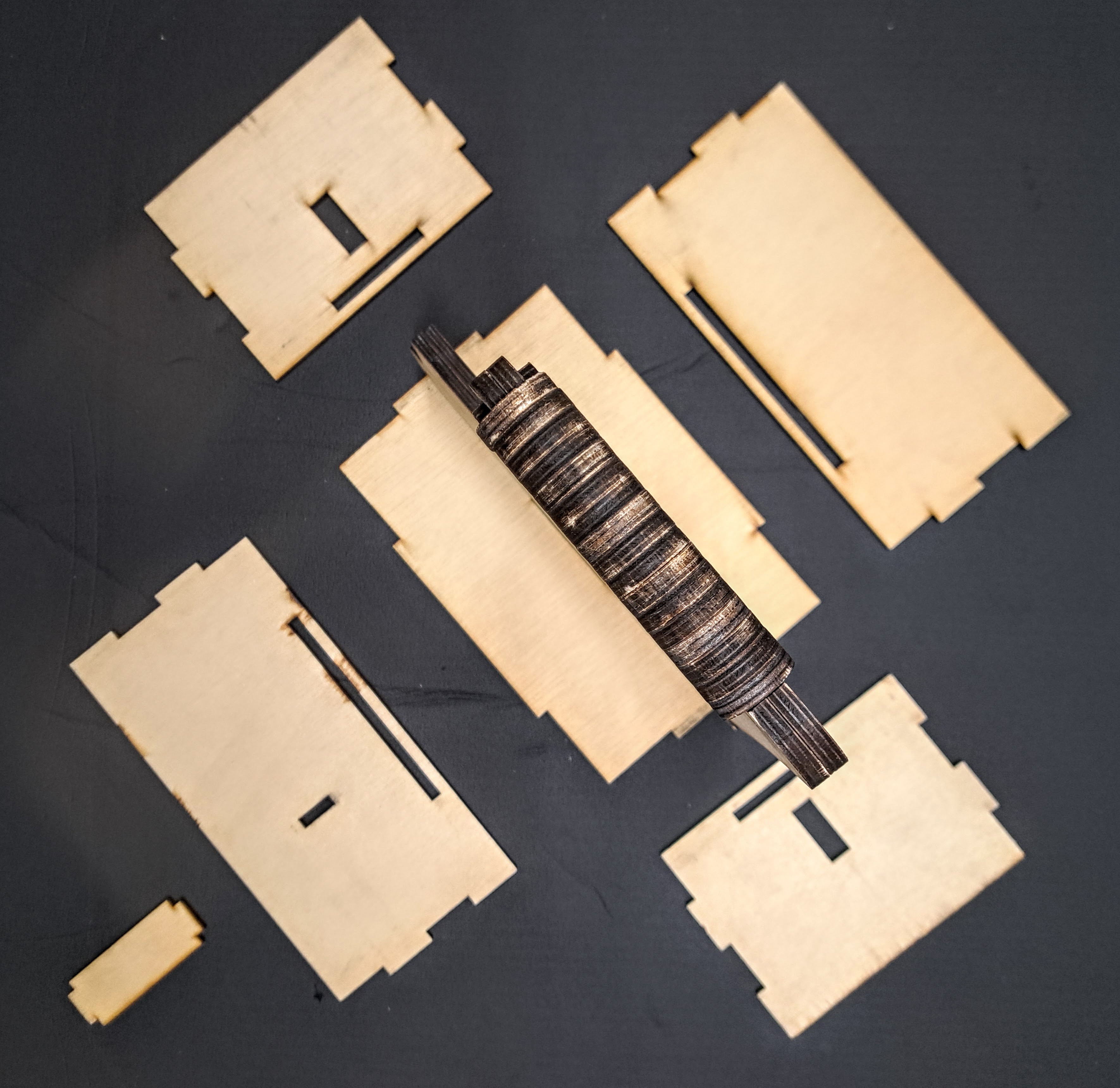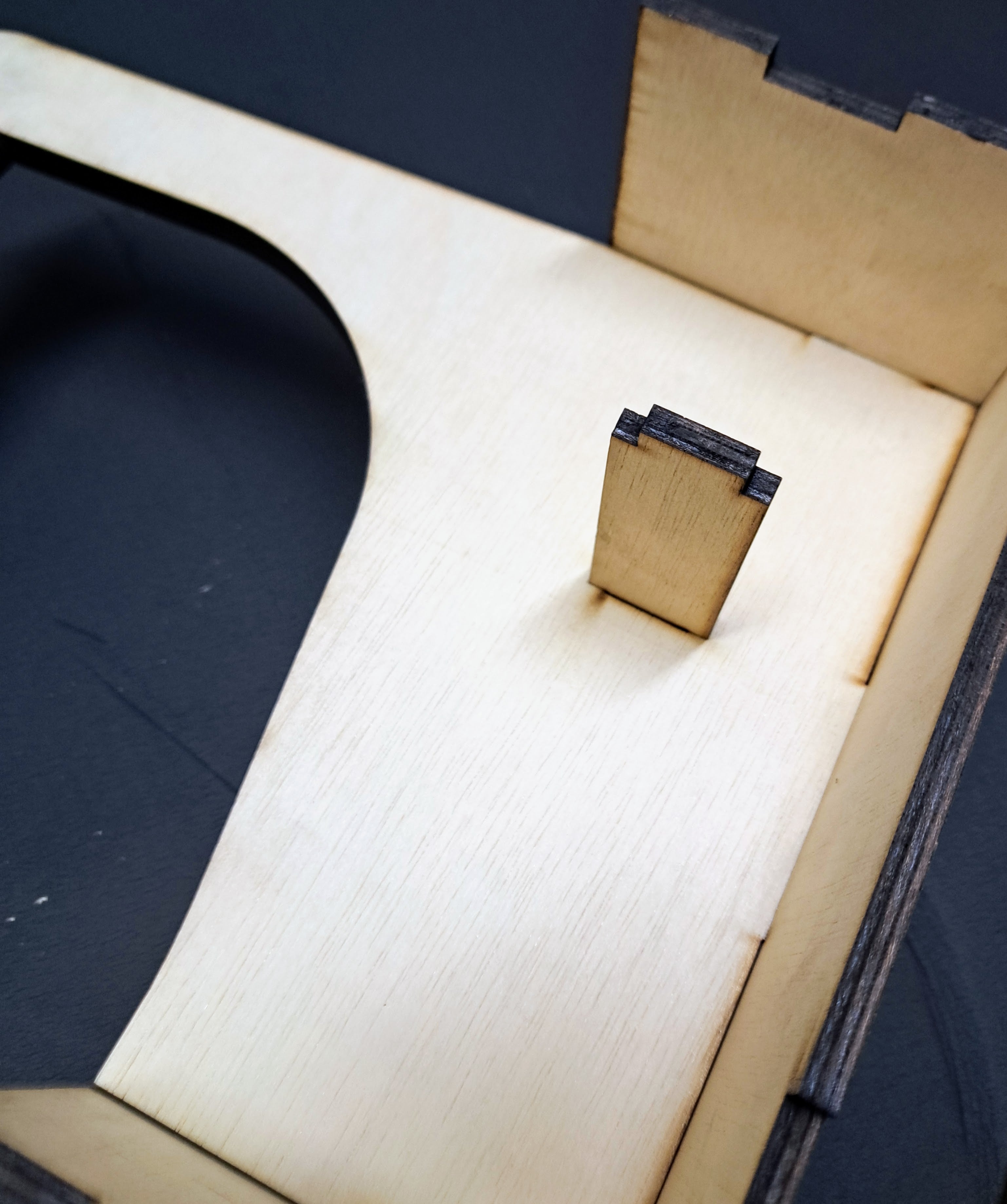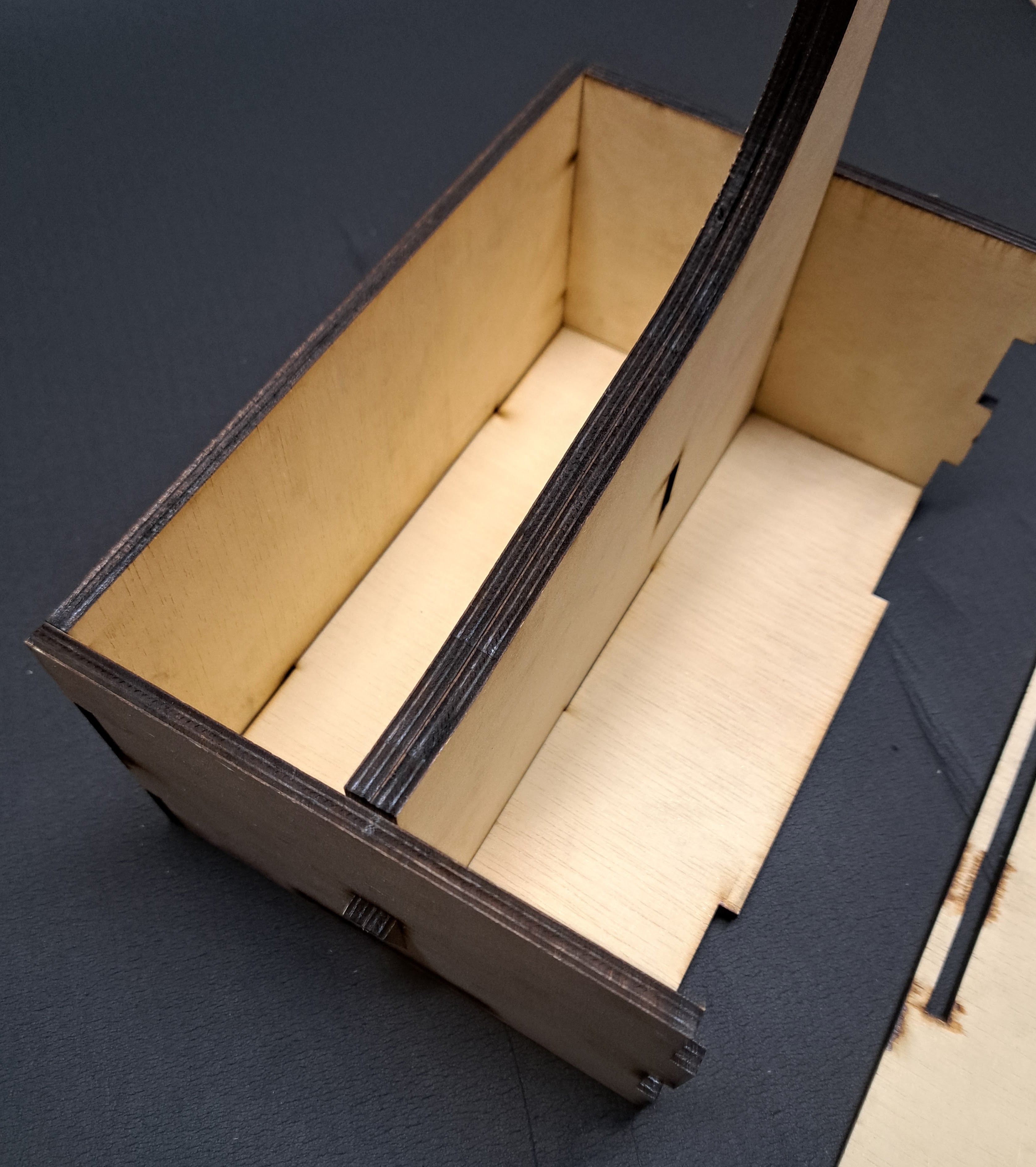 Lay on side. Add divider to handle slot, align and secure snack side panel.