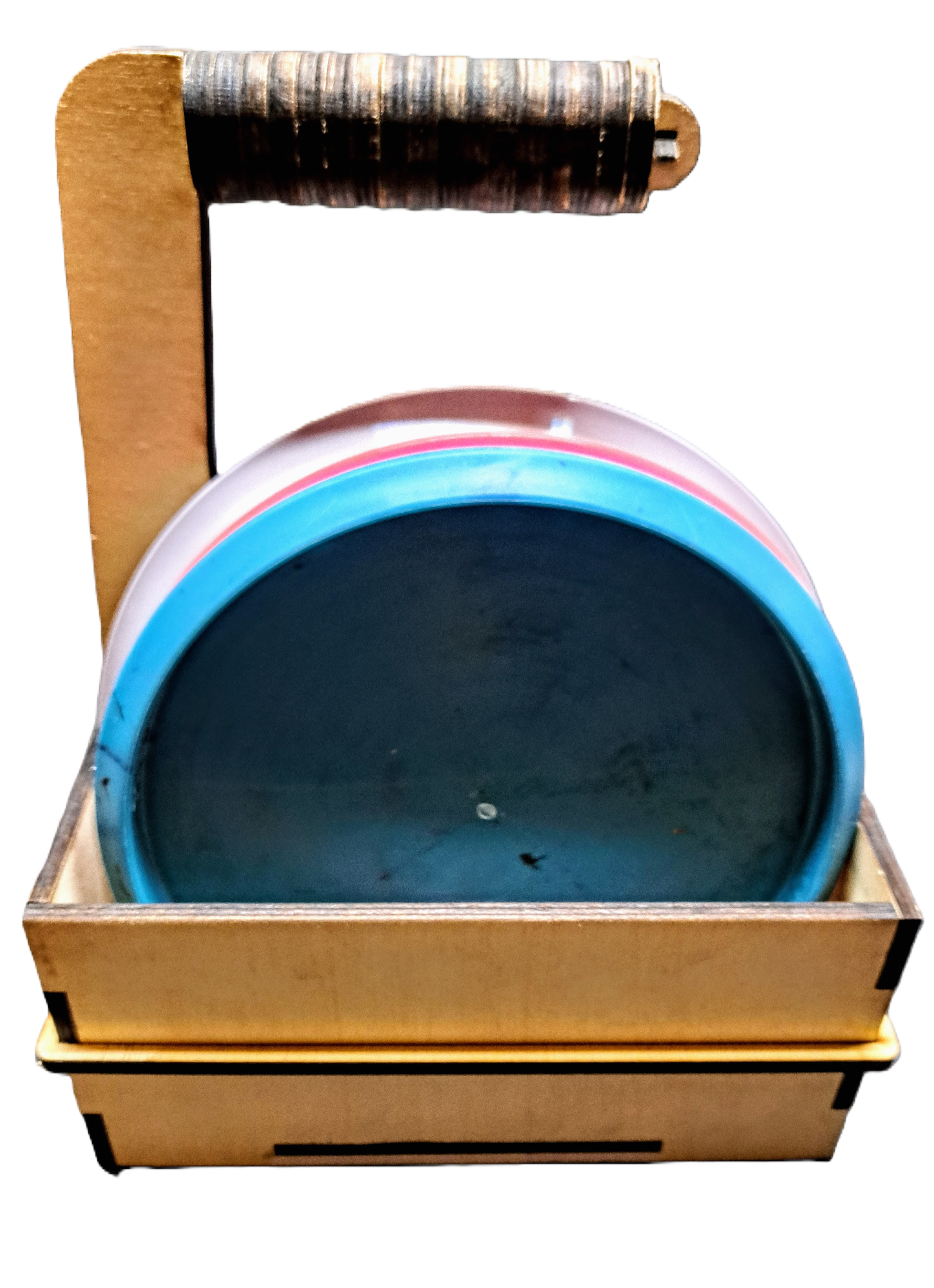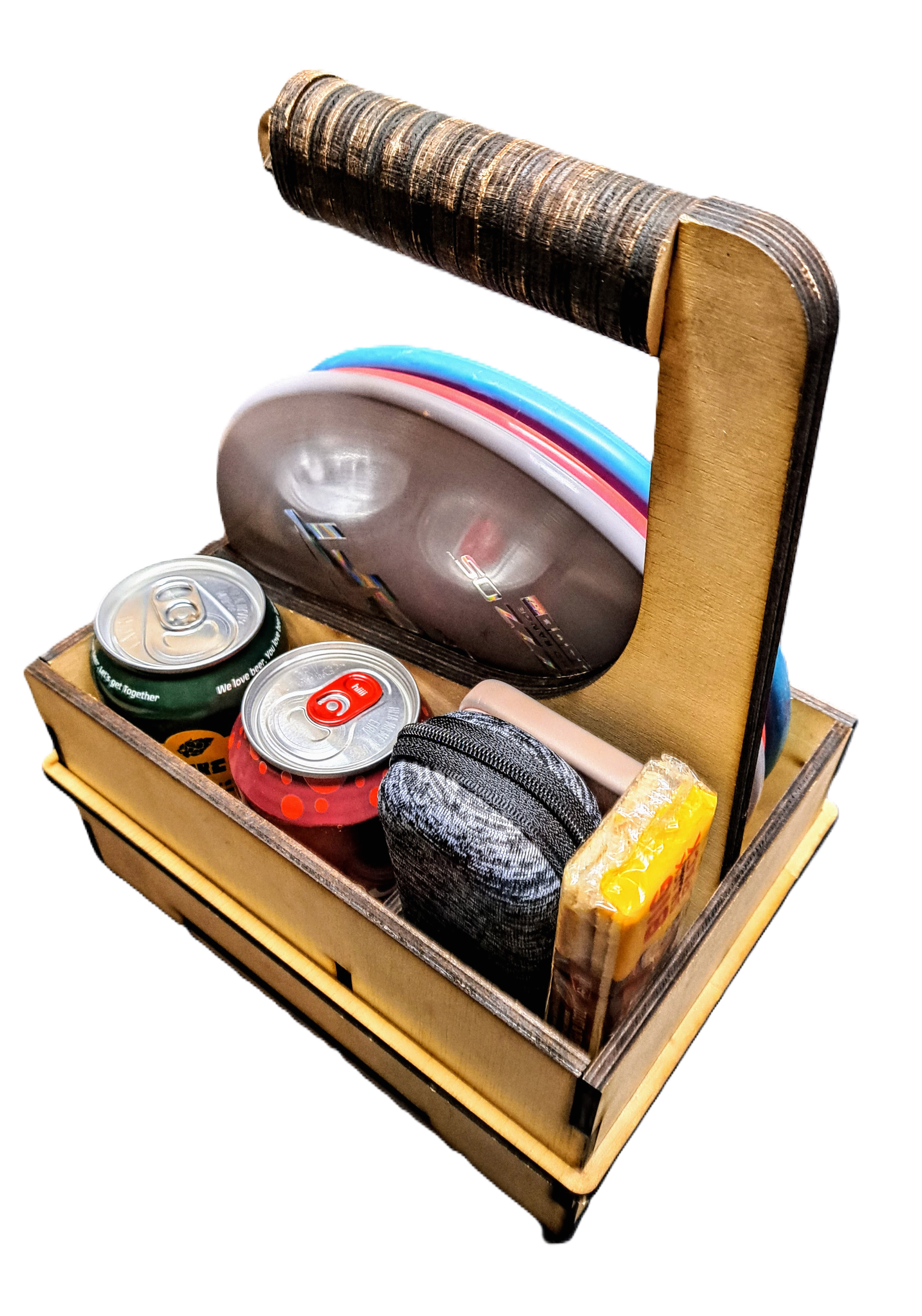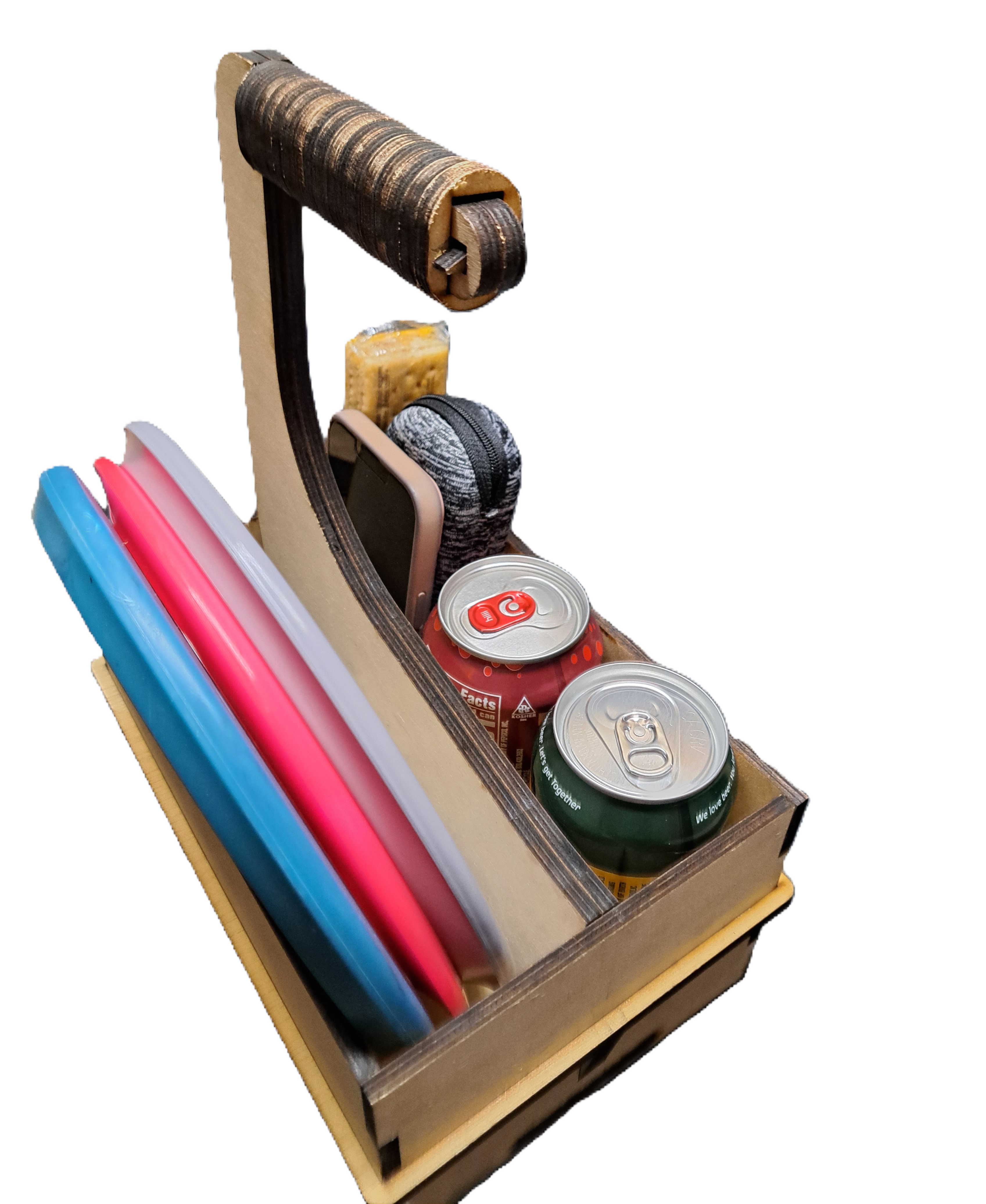 Introducing the DiscNic Basket - The handy companion for disc golf enthusiasts who desire convenience on the course. Crafted in Michigan from premium plywood, this versatile disc holder is designed for the player who wants to streamline their experience without compromising on functionality. Carry up to 4 discs on one side and beverages, snacks, phone and other essentials on the other. Or leave the rations behind and go all in with 8 discs. The DiscNic Basket is designed to always be upright, easy to carry, set down and pick up. Discs are always at the ready and easy to select and return to their proper spot in the lineup.